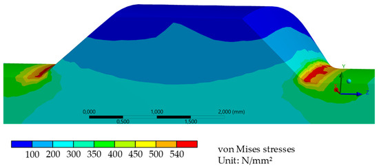 Figure 9 illustrates the notch stresses of specimen 12 with the smallest fillet radii. The highest stress concentrations were developed on the surface of the fillet areas. For this specimen, the local stresses at the fillet were approx. 55% higher than in the nearby rib valleys. The maximum stresses simulated by FEM were localized in the center of the transversal ribs, where the rib height reached its maximum. The rib itself showed much lower stresses. This is in good agreement with the results in the literature [19,25].