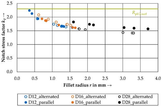 In the next step, the maximum notch stress factors were calculated from FEM results by implementing the von Mises stresses as σmax and σnom = 300 N/mm2 in Equation (1). A depiction of these results can be found in Figure 10. Therein, the notch stress factors kT are plotted over the local fillet radius r.
