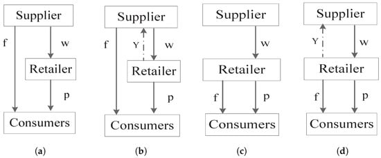 The freshness-keeping effort refers to a series of freshness-keeping inputs made by the supply chain members to minimize the loss and maintain the freshness of agri-products. Keeping agri-products fresh during storage, transportation and distribution has been widely discussed in the literature. In general, current research on keeping agri-products fresh focuses more on situations where the upstream supplier or farmer takes on the freshness-keeping effort. Mohammadi et al. [1] proposed three decision-making approaches to improve product waste in the FAPSC, including a decentralized approach, a centralized approach and a coordinated approach, where the supplier determines the investment level in freshness-keeping technology and the wholesale price while the retailer determines the order quantity and retail price. Dolat-Abadi [2] studied the farmer–retailer Stackelberg game in the daily and bourse markets within an FAPSC, as well as the optimal freshness-keeping investment and ordering decisions of farmers and retailers, respectively. Liu et al. [3] constructed a dynamic control model in an FAPSC including an online retailer and an offline producer, where the retailer determined the optimal advertising effort and the producer determined the optimal freshness-keeping effort. Liu et al. [4] developed an FAPSC including one supplier providing the freshness-keeping effort and one e-tailer taking on the value-added service, taking the e-tailer’s information sharing strategy into consideration. Several other studies have enriched the above research by considering the situation where the downstream retailer exerts the freshness-keeping effort. Cai et al. [5] took the freshness-keeping effort of fresh agri-products in long-distance transportation into consideration to study the optimal wholesale price decision of the producer and the optimal order quantity, freshness-keeping effort level and retail price of the distributor. Yang and Tang [6] studied the optimal pricing decisions of fresh produce supply chain members and the freshness-keeping decisions of the retailer under three distribution modes, including retail, dual-channel and online-to-offline. Wang et al. [7] examined a green fresh produce supply chain in which the upstream farmer invests in improving the greenness of their fresh products and the downstream retailer takes on the freshness-keeping effort to transport and sell the green fresh products to end consumers. In addition, Ma et al. [8] investigated the scenario where the freshness-keeping effort is provided by a third-party logistics service provider via both the decentralized and centralized modes. In particular, current literature examines the situation where both the supplier and retailer take on the freshness-keeping efforts. Yan et al. [9] studied the impact of the manufacturer‘s fairness concerns on the FAPSC and the optimal decision problem, considering that both the manufacturer and retailer contribute towards the freshness-keeping effort. Liu et al. [10] designed contracts to incentivise logistics service providers to improve their freshness-keeping efforts. The results showed that a flexible revenue-sharing policy could improve the delivery efficiency of fresh products. Xu et al. [11] constructed four models to explore the platform’s optimal logistics strategy and the effect of private brands on the freshness-keeping effort. The main results found that the logistical costs and the service level influence the optimal logistics mode strategy. Unlike the above literature, this paper considers the scenario where either the supplier or the retailer takes on the freshness-keeping effort, treated as an endogenous variable.