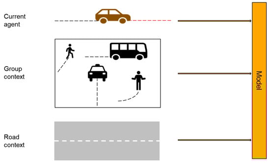 The group context is considered in a similar way as the agent trajectory representation. For each agent, the surrounding agents that can influence the behavior in traffic are considered, and we are including the ones that are around the current agent, e.g., 50 m around. As mentioned before, because the number of agents in the nearby area is variable and the inputs to the neural model have a fixed size, we use a maximum number of context agents nn. For each agent included in the context, we have the agent type: (flags [0/1] [real/dummy agent] [is car] [is obstacle] [is bicycle] [is pedestrian] [is truck/bus]). For example, a truck can be defined as 100,001 and a bicycle as 100,100. For each past point, we consider the coordinates x, y, the pair sin(a), cos(a), where a is the heading angle, and the speed.