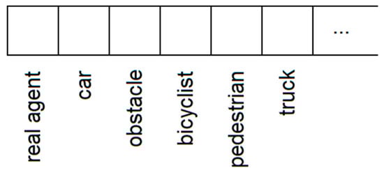 The identification of an agent. Each of the six attributes of the input instance has a binary value designating the presence or absence of a feature. The first attribute is 1 if the block identifies a real agent and 0 if it identifies a dummy agent. The following five attributes constitute a one-hot encoding of the agent type, e.g., the second attribute is 1 if the agent is a car and 0 if it not a car, and so on.