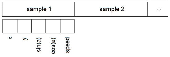 The representation of the past trajectory. Each trajectory sample is defined by the (x, y) position, a tuple (sin(a), cos(a)) representing the heading angle a, and the instantaneous speed.
