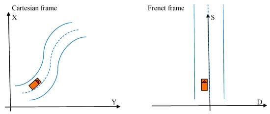 For our problem, the x coordinate is normalized between –10 m and 10 m relative to the center line of the road. The y coordinate is normalized between –150 m and 150 m. Thus, the positions of the agents are in fact Frenet coordinates (described in the next paragraph) relative to the present position of the ego vehicle: x corresponds to the lateral displacement (the Frenet coordinate d) relative to the center line of the road, and y corresponds to the longitudinal displacement (the Frenet coordinate s) but relative to the ego agent position. The use of Frenet coordinates has the advantage that it avoids special cases caused by the change of perspective in curves and which may need more training data to cover various types of curves. Using the presented approach, curves are handled in the same way as straight road segments.