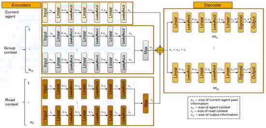 There is an encoding part for the ego vehicle and also for the rest of the agents (the closest nn agents to the ego agent; in our case, nn = 9). That consists in three fully connected layers with a leaky ReLU (leaky rectified linear unit) activation function for each case to encode the input information.