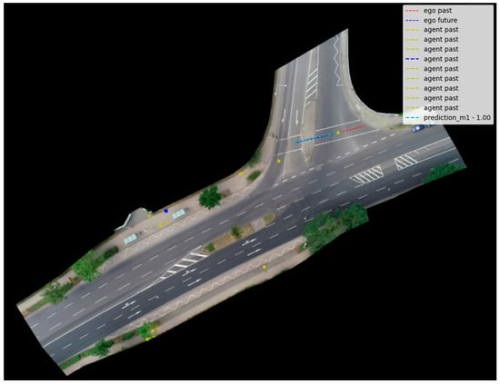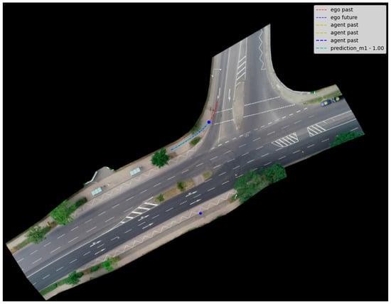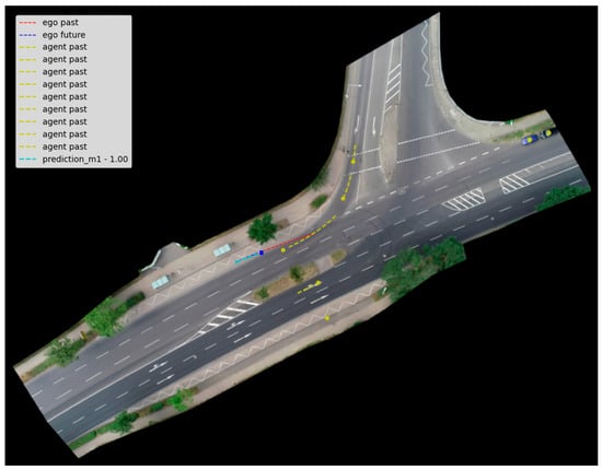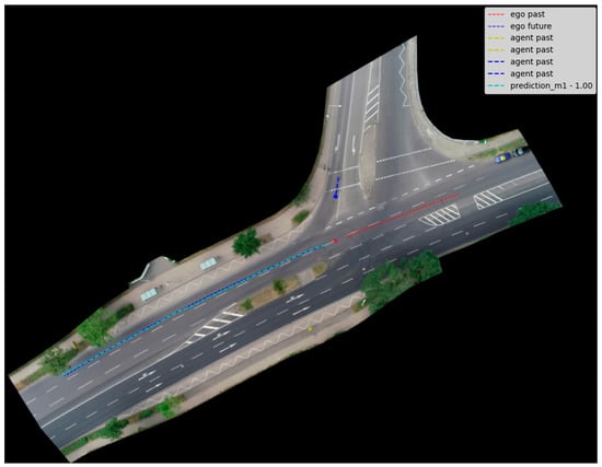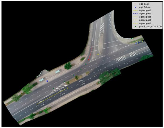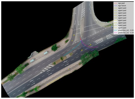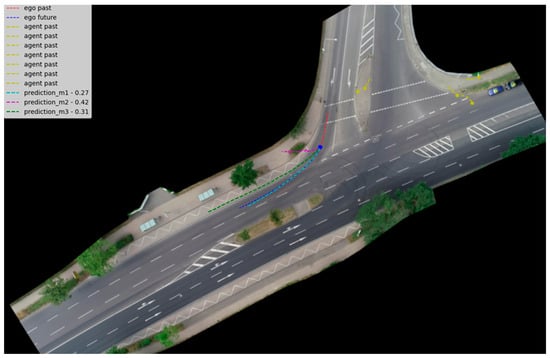 Similar results are presented as follows, this time considering the multimodal prediction. In these scenarios, the predicted trajectory is drawn with light blue, magenta, and green. The current agent types are a car (Figure 16) and a bicyclist (Figure 17).