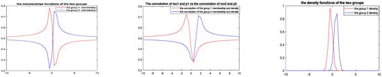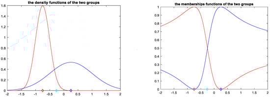 Fuzzy membership functions and probability densities of two clusters associated with N1 and N2 red color corresponds to the first group and the blue one corresponds to the second color.