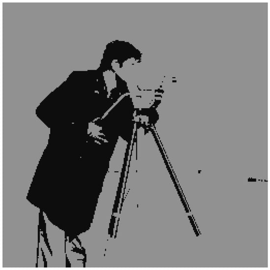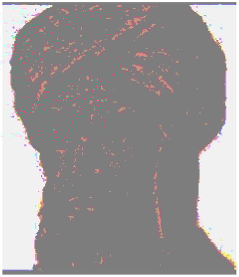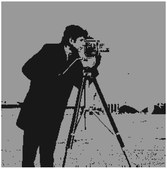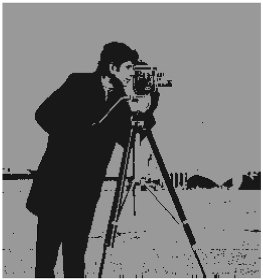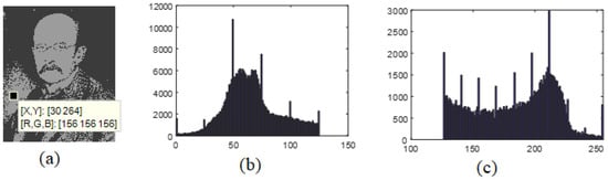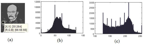 The image obtained after decompression is shown in Figure 3a (after compression using 2-GMM). The histograms of group 1 (center = 58.95, std = 15.98) and group 2 (center = 58.95, std = 15.98), obtained using 2-GMM, are given in Figure 3b,c, respectively.