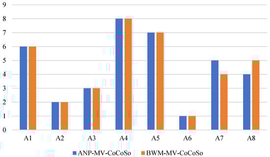 Furthermore, Figure 4 compares obtained rankings using MV–CoCoSo, CoCoSo, EDAS, and MARCOS by considering the ANP outcomes.