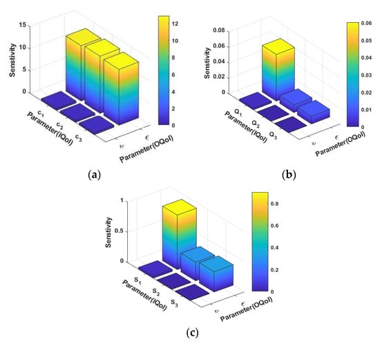 NLSA of the involved model parameter on the output QoI (a–c).