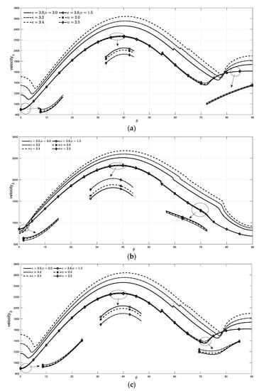 Figure 4 describes the variations of the phase velocity of the three waves concerning the phasor frequency. From the graphical structure, it is found that the velocity profile of each wave propagating through the medium is directly proportional to the real part of . However, the value of the amplitude decreases by increasing the imaginary factor of the angular frequency. For the small values of the angle of incidence, the response of the imaginary factor is the opposite. The response of phase velocity is more sensitive to the real part of the angular frequency of the incident wave.
