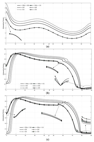 (a) Attenuation factor1 for different angle of incidence; (b) Attenuation factor2 for different angle of incidence; (c) Attenuation factor3 for different angle of incidence.