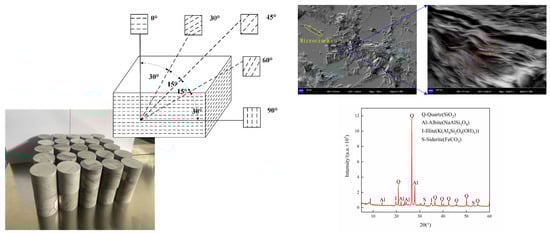 The samples used in the test are shown in Figure 1. In this test, the samples were assayed by SEM and XRD, and the results of the XRD tests indicated that the samples had an internal composition of sandstone. The SEM test results showed that the sample contained obvious holes, cracks, and layered material components, and the bedding effect was obvious. In addition, to meet the requirements of the test, the samples were machined into cylindrical specimens with bedding angles of 0°, 30°, 45°, 60°, and 90° and diameters/heights of 50 × 50 mm. The end face accuracy requirements met the requirements of the triaxial dynamic compression test.