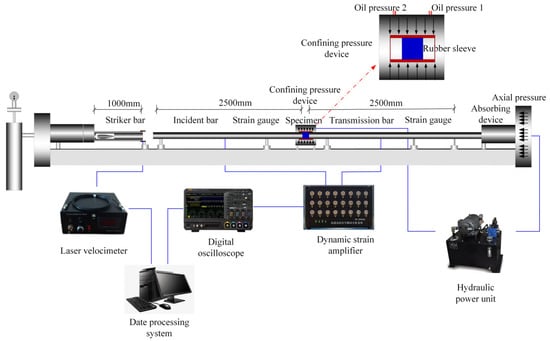 With the development of science and technology, some scholars have developed true triaxial dynamic test systems [24,25,26]. With the aid of a true triaxial test system, You examined the impact of the medium principal stress on sandstone and found that the medium principal stress was positively correlated with the dynamic elastic modulus [27]. Gong conducted a true triaxial dynamic impact test on granite and found that the prestress was positively correlated with failure strain. Three-dimensional static stress also significantly increased the rock strength [28]. Luo studied the law of damage accumulation and energy evolution in granite under true triaxial conditions and found that under triaxial dynamic loading, granite was primarily shear-fractured [29]. Wu showed that the volume strain and number of cracks in the rock rose as the incident energy increased [30]. Liu carried out true triaxial dynamic impact tests on sandstone, marble, and granite and the findings indicated that varying loading patterns had a marked effect on the damage pattern of sandstone. The failure mode, damage state, and crack propagation process are different for different lithologies [31,32]. Because of the complexity of the SHPB tests, SHPB numerical simulation techniques have developed rapidly. Some scholars have established numerical simulation triaxial SHPB models by using different means and conducting impact tests and found that numerical simulations can verify the experimental results [33,34,35].