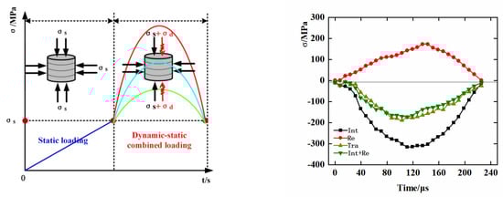 Sandstone with 0°, 30°, 45°, 60°, and 90° bedding angles was first subjected to 10 MPa hydrostatic pressure and then to 1.6, 1.2, and 0.8 MPa in dynamic load impact. The test scheme is shown in Figure 3. Repeatability tests were performed three times for each condition. The sample satisfied the stress equilibrium, as illustrated in Figure 3. The dynamic strains and stresses in the rock samples can be derived from the below equations [15]: