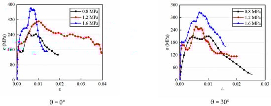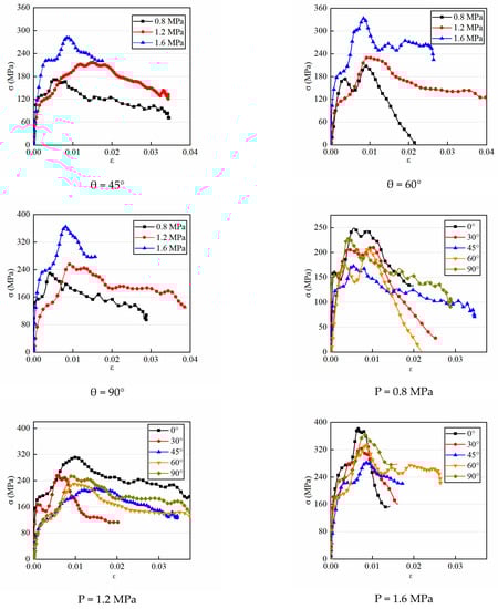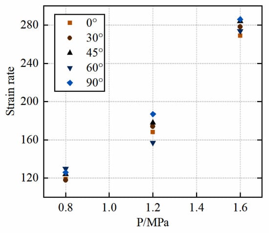 Dynamic stress–strain curves present the strain and stress patterns throughout the process of rock impact deformation. Therefore, in Figure 4, the sandstone stress–strain curves were plotted for various bedding angles and impact pressures. As shown in the Figure, the curve showed no compaction stage. A stress–strain curve presents an elastic phase, a plastic phase, as well as a post-peak phase. The stress–strain curve of sandstone showed obvious ductile failure under three-dimensional dynamic loading. This failure might be due to the high initial hydrostatic pressure, which greatly enhanced the ductility of the sandstone. In addition, we can also note that bedding angle and impact pressure had a marked effect on the peak value of the sandstone stress–strain curve. With an enhancement in impact pressure, the peak value of the sandstone’s stress–strain curve also rose. It is not surprising to observe that bedding angle and impact pressure did not have a remarkable effect on the slope of the sandstone’s stress–strain curve. Additionally, the correlation between strain rate and impact pressure is illustrated in Figure 5, with a positive correlation between strain rate and impact pressure. Under the given loading conditions, the author selected experimental data with similar strain rates for analysis [36].