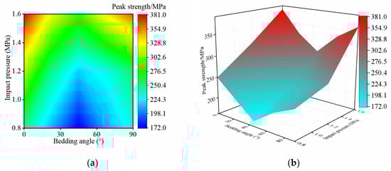 During engineering construction, the intensity of the rock mass is very significant. It is thus essential to examine the peak strength and the coupling strength of sandstone under three-dimensional dynamic compression for engineering support. Figure 6 and Figure 7 show the peak strength, coupling strength scatter diagram, two-dimensional cloud diagram, and three-dimensional surface diagram of sandstone under various bedding angles and impact pressures. In this paper, the coupling strength is the sum of the peak strength of sandstone and the axial static load of rock. Figure 6 and Figure 7 show that there was a positive association between the coupling and peak strengths of sandstone and the impact pressure. For instance, see Table 1, when the impact pressure was 0.8 MPa, the coupling and peak strengths of 0° bedding sandstone were 249 MPa and 259 MPa, respectively. However, under an impact pressure of 1.6 MPa, the coupling and peak strengths of the 0° bedding sandstone were 381 and 391 MPa, respectively. As the bedding angle rose, the coupling and peak strengths of sandstone initially declined and later rose. In addition, with increasing impact pressure, the increase in the amplitude of the peak strength of the 0° stratified sandstone was larger than that of sandstone at other angles.