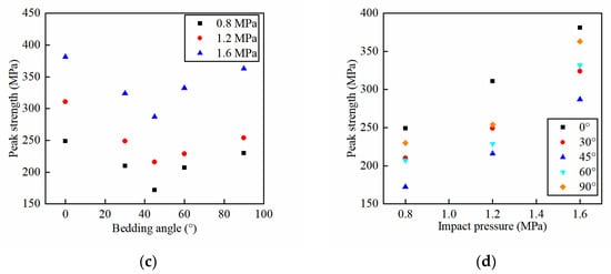 Peak strength of the sandstone samples under different loading conditions (a) Two-dimensional cloud map of peak strength. (b) Three-dimensional map of peak strength. (c) Different bedding angles. (d) Different impact pressure.