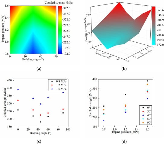 Coupled strength of sandstone under different loading conditions. (a) Two-dimensional cloud map of coupled strength. (b) Three-dimensional map of coupled strength. (c) Different bedding angles. (d) Different impact pressure.