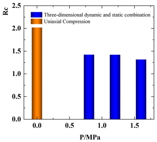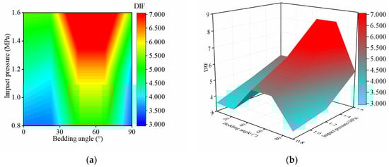 A rock strength under static loading is not the same as its strength under 3D dynamic compression. To compare the strength of rock under three-dimensional dynamic compression with that under static loading, a dynamic strength growth factor was considered to characterize the sandstone’s strength properties under 3D dynamic compression. Figure 8 shows the two-dimensional nephogram and three-dimensional surface diagram of the dynamic strength growth factor of sandstone. The figure shows that as the bedding angle increased, the dynamic strength growth factor of sandstone decreased first and then increased, which was basically consistent with its strength law. The sandstone’s dynamic growth factor progressively rose as the impact pressure augmented. This finding suggests that bedding angle and impact pressure had a marked effect on the sandstone’s dynamic strength growth factor under 3D dynamic compression conditions. In addition, to study the anisotropy of sandstone, the anisotropy coefficient was introduced in the current work. Figure 9 presents the anisotropy coefficient of sandstone under three-dimensional dynamic compression. The figure shows that the anisotropy coefficient of sandstone under 3D dynamic compression was quite different from that under uniaxial loading. This observation indicates that the loading mode significantly affects the anisotropy of sandstone. Therefore, in underground engineering, we should also consider that for the same bedding angle, the anisotropy is different when the loading mode is different. In addition, the Figure suggests that the impact pressure affects the anisotropy of sandstone less than the loading pattern. When the impact pressure increased, the anisotropy coefficient of sandstone was reduced progressively. This decrease shows that the anisotropy of rock decreased with an increasing dynamic load. This trend occurred because when the dynamic load was small, the fracture of sandstone generally expanded along the bedding, weak plane, microstructure, etc., but when the dynamic load was large, the fracture of sandstone generally did not expand along the bedding, weak plane, microstructure, etc. Therefore, when the impact pressure increased, the anisotropy coefficient of sandstone decreased gradually.