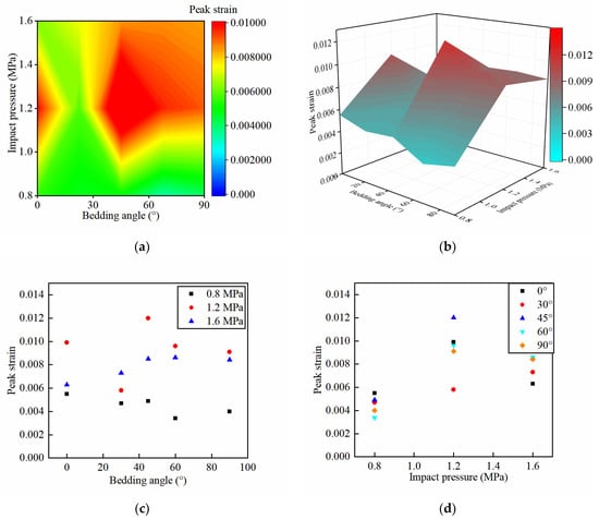 Peak strain of sandstone under different loading conditions. (a) Two-dimensional cloud map of peak strain. (b) Three-dimensional map of peak strain. (c) Different bedding angles. (d) Different impact pressure.