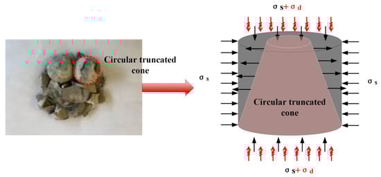 In addition, it is obvious that the sandstone at 0° and 45° bedding angles showed failure along the bedding planes under an impact pressure of 1.2 MPa, while the failure fragments of 30°, 60°, and 90° bedding angle sandstone were of a typical circular table type. Under an impact pressure of 1.6 MPa, sandstone with bedding angles of 0°, 30°, 45°, and 60° presented typical circular table fragments. Among sandstone samples with different angles, the sandstone with a 90° bedding angle was characterized by obvious round-table fragments due to its greater degree of fragmentation. To reveal the failure mechanism, as shown in Figure 11, a force analysis of sandstone under a three-dimensional dynamic load was performed. As shown in the Figure, the sandstone was subjected to a combined static and dynamic load in axial direction and a confining pressure in radial direction. Because the axial static load and dynamic load were far greater than the confining pressure, an oblique shear force formed inside the sandstone; because of the oblique shear force inside the sandstone, the interior of the rock formed an oblique fracture plane. In addition, when the bedding sandstone was subjected to both dynamic and static loads, the rigidity of the confining pressure chamber was much higher as compared to the strength of the rock, and the sandstone near confining pressure chamber was much more fragmented than that away from the confining pressure chamber. Consequently, the fragmentation of sandstone under 3D dynamic compression led to the formation of circular-table fragments.
