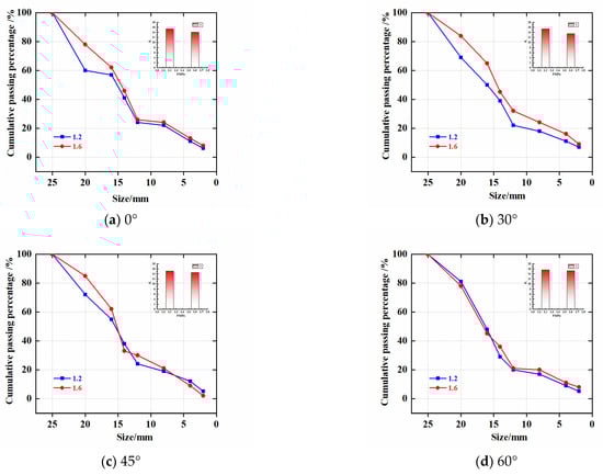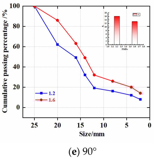 As shown in Figure 12, fragments of the sample under triaxial dynamic compression were gathered and then screened, and the distribution of the particle size was mapped. In addition, since the rock was not damaged under an impact pressure of 0.8 MPa, this paper only addressed the fractals of rock fragments under the impact pressures of 1.2 and 1.6 MPa. The Figure indicates that the impact pressure showed an inverse relationship with the average particle size of sandstone. Moreover, the higher the impact pressure, the more the particle size distribution curve tended to bend upward.