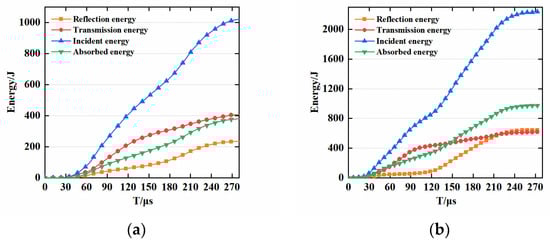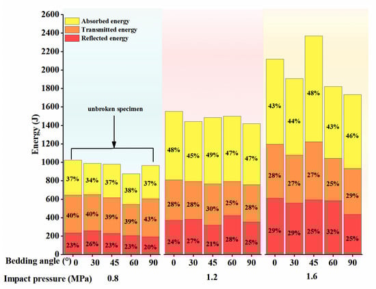 Figure 13 is a schematic diagram of each energy proportion of sandstone. It shows that the reflected energy of sandstone increased gradually with an increasing impact pressure. It is worth noting that under an impact pressure of 0.8 MPa, the transmission energy of sandstone was significantly larger than that of sandstone under other impact pressures. This occurred because, under an impact pressure of 0.8 MPa, the sandstone was not disrupted owing to the low impact pressure and the low energy carried by dynamic load shock waves, and the undamaged sandstone was more likely to propagate the dynamic load shock wave. Therefore, under an impact pressure of 0.8 MPa, the transmission energy of sandstone was significantly larger than that of sandstone under other impact pressures. In addition, under an impact pressure of 0.8 MPa, the absorption energy of sandstone was significantly smaller than that of sandstone with other impact pressures. Figure 14a–c presents the energy evolution trend for sandstone. As can be seen in the Figure, the energy evolution of sandstones at various impact pressures followed a similar trend, with marked differences in the final sandstone energy values.