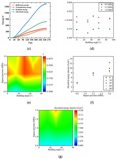 Figure 14d,e shows the energy utilization ratio diagram of sandstone. It shows that the energy utilization rate of undamaged rock was significantly lower than that of damaged rock. This rate difference was observed because most of the energy in undamaged rocks was transmitted, while most of the energy in damaged rocks was used for the expansion and penetration of new cracks. Figure 14f shows a schematic representation of the density of absorbed energy in sandstone. In the Figure, we can observe that the density of absorbed energy in sandstone increased linearly with an increasing impact pressure. This occurred because, as the impact pressure augmented, the sandstone breakage progressively increased, and rock breakage absorbs a large amount of energy.