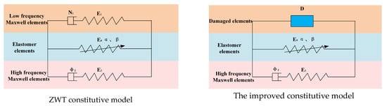 where , , and are elastic parameters, and are elastic parameters at low strain rates, and and are elastic parameters at high strain rates. During impact, rock failure has both a damage effect and an impact pressure effect. First, during the combined static and dynamic loading test, the load duration is much less than the low-frequency Maxwell time. Therefore, the modified ZWT dynamic damage constitutive model deletes the low-frequency Maxwell elements [37,38], as shown below: