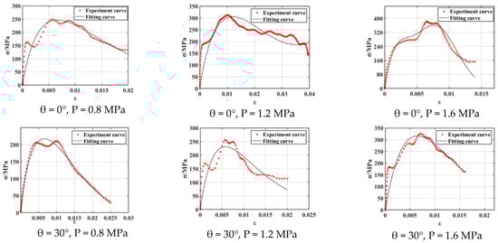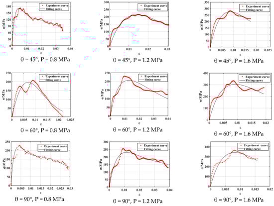 The verification of the constitutive model was essential for assessing its soundness. Therefore, the constitutive model was validated against the test curves obtained from the above tests and the established constitutive model. Table 4 shows the model parameters of different samples as obtained by calculation. Table 4 displays that, as the impact pressure rose, the value of E2 gradually increased. This finding demonstrated that the strain rate rose with an enhancement of the impact pressure, and the rate-related elastic parameter E2 increased accordingly. Figure 16 presents the theoretical curve of the constitutive model and the sample’s stress–strain curve. The Figure shows that the two curves almost coincide, which indicates that the constitutive model established by the authors is reasonable. It is worth mentioning that some scholars conducted 3D modeling of materials based on the XCT test, which well characterizes the mechanical behavior of materials [39,40]. At the same time, pores and fissures in a rock significantly affect its mechanical behavior. In a future study, the constitutive model should consider these factors and carry out an in-depth study. In addition, relatively few rock samples were used in this paper; so, the authors believe that 3D XCT tests can be carried out in future research [41], rock modeling can be carried out, and a large number of numerical analyses can be performed. It will be more reasonable to verify the rationality of the constitutive model by using more numerical rock samples.