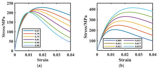 In this section, the influence of the damage parameters n and εf on rock mechanical behavior is addressed. A sandstone constitutive model with an impact pressure of 1.2 MPa and a bedding angle of 60° was selected for the analysis, for which the constitutive parameters were determined, as shown above. As shown in Figure 17, the damage parameters n and εf significantly affected the mechanical behavior of the rock. The parameter n primarily affected the post-peak plastic behavior of sandstone. If the parameter n changed from 0.65 to 0.98, the deformation rate of sandstone after the peak increased gradually. The parameter εf primarily affected the peak and post-peak mechanical behavior of sandstone. When the parameter εf changed from 0.009 to 0.019, the peak value of the sandstone increased from 200 MPa to 400 MPa. This increase indicates that the damage and deterioration of the rock primarily affected the peak and post-peak plastic behavior of the rock. From an engineering point of view, in engineering support, we should consider the damage and the deterioration of the rock’s internal structure. When there is a high degree of internal damage in the rock, the peak strength and post-peak bearing capacity of the rock rapidly decrease. Therefore, we should strengthen the support for engineering rock with a large degree of damage.