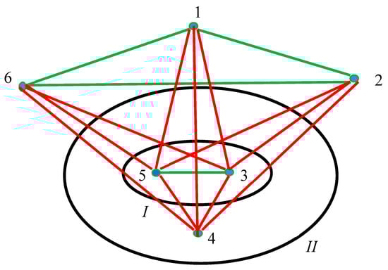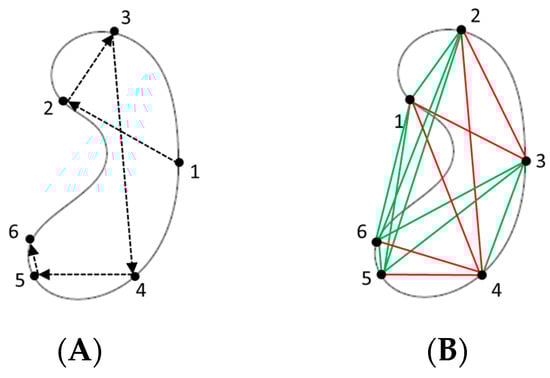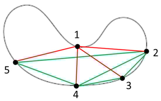 Figure 4, the points numbered “1” and “2” are chosen within the interior region, i.e., within the contour, whereas the points numbered “2”, “4”, “5” and “6” are located in the exterior region of the plane, i.e., outside the contour. Let us connect the points located within the same region (whether interior or exterior) with green edges and the points placed within the different regions with the red edges, as shown in