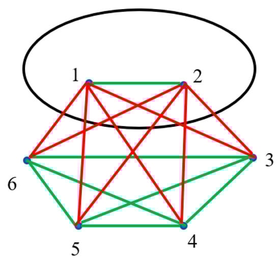 Figure 5. Indeed, the triangles “136”, “236”, “346”, “356”, “234” and “156” are monochromatic (red). No monochromatic green triangles are recognized in the graph, as shown in