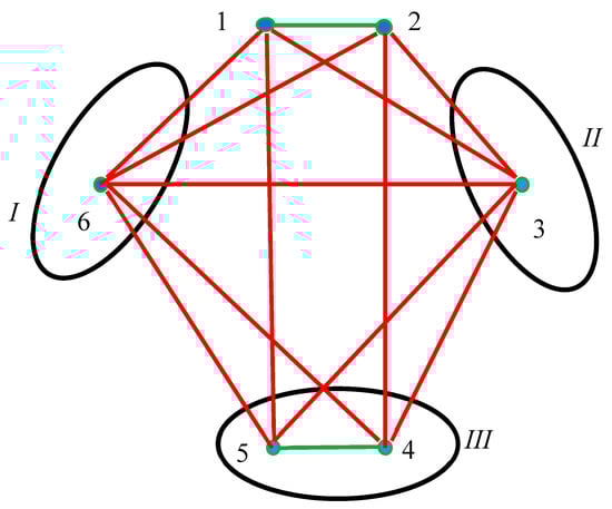 Figure 6. Again, we connect the points located within the same region (whichever it is) with green edges and the points placed within the different regions with red edges; thus, the complete graph emerges, as shown in