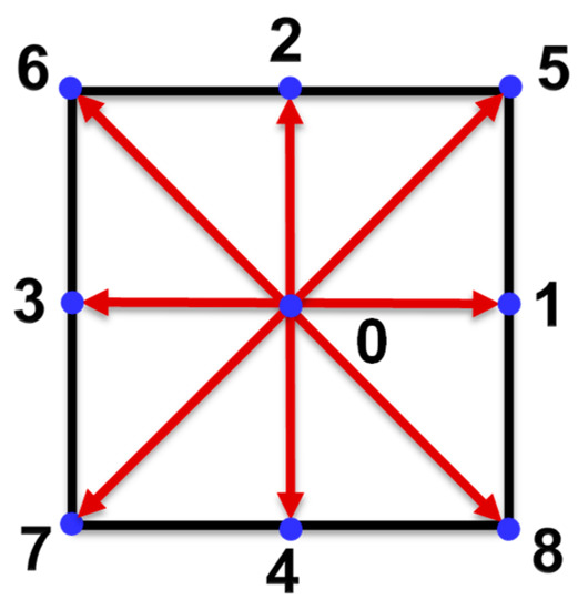 The classical D2Q9 model is used in the LBM discrete velocity model [17,18]. The model is depicted in Figure 2, and the following parameters describe its equilibrium distribution function: