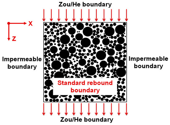 The seepage direction is set to follow the Z-direction of the SRM, and the flow is set to drive the model at a constant temperature (T = 20 °C) and pressure difference (Δp = 3.67 × 10−2 Pa) to make the seepage simulation results more realistic. The specific boundary conditions used in the calculation model are shown in Figure 3. The additional pertinent settings and calculation criteria for the validation example given above apply here as well (Table 2). Additionally, refer to Section 2.3 and choose the typical dimensions of models between 10 and 100 mm (grid unit: 100–1000 l.u.) to simulate various SRM models. There are 342 different simulation test conditions in total (Table 1).