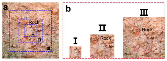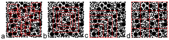 In addition, this section also provides an extensive discussion on the selection of the optimal unit volume model size of SRMs based on the findings of the research. Bear [39] made the initial suggestion for the representative elementary volume (REV). The REV scale, which represents the critical scale for the change from unstable to stable mechanical properties of rock and soil mass, is an objective reflection of the size effect of the mechanical properties of the rock and soil mass [40]. Larger-particle rock components and small soil particles comprise the SRM. Figure 16 of the research area of the research group illustrates how the internal structure of the model changes with continuous changes in the model’s size [12]. Figure 17 shows that the REV–I region consists of single or partial block stones; the REV–II region has a certain amount of block stones and uses fine-grained soil as the filling material; the REV-III region contains a variety of block stones with different particle sizes in addition to the block stones that cannot be ignored in comparison to the REV–II region, which together forms a multilevel SRM. Additionally, the authors of References [41,42] used homogenization to create multiscale LBM models that successfully mimicked single–phase and two–phase flow simultaneously in pores of completely different length scales. This could be also applied to an SRM where the particle sizes and pores vary greatly. This demonstrates that the test and calculation results can only accurately reflect the pertinent properties of the SRM when the size range of the SRM studied is greater than or equal to its REV. The balance between numerical calculation accuracy and calculation efficiency should also be thoroughly taken into consideration on this basis for the numerical simulation of the size effect on SRM seepage characteristics.