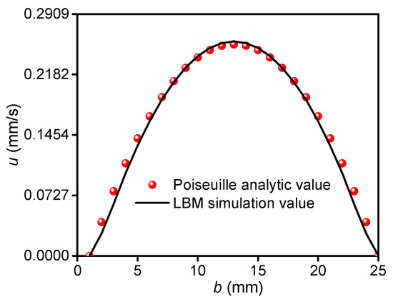 The self-programmed LBM program is validated using the classical Poiseuille flow [17,18], and the validation computational model area is chosen as a grid of 50 × 25 mm (500 × 250 l.u.) with the same boundary treatment as described in Section 2.2.1. Table 2 displays the specific computational parameters, where l and b are the length and width of the computational model, and Δp is the pressure difference between the inlet and outlet of the fluid.