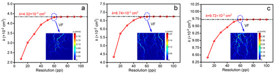 The permeability of the three models exhibits a trend in gradual improvement with the resolution and tends to be stable when the resolution reaches 60 ppi, as can be seen in Figure 7. Permeability dispersion degree cv values at this time are 0.00236, 0.00061, and 0.00028, respectively. Additionally, it is discovered that the porosity and rock content of the model has little bearing on the relationship between resolution and permeability (SRM–1, n = 0.3642, Cr = 67.69%; SRM–2, n = 0.4008, Cr = 61.07%; SRM–3, n = 0.5060, Cr = 52.96%) by comparing the velocity field cloud map (velocity field, VF) of the three models with a resolution of 60 ppi. The velocity field distribution in the models with various porosity and rock content exhibits a steady–state effect when the model resolution is 60 ppi. To guarantee the precision and effectiveness of the LBM permeability calculation, the resolution of the model sample is set to 60 ppi in the subsequent simulation reported in this paper.