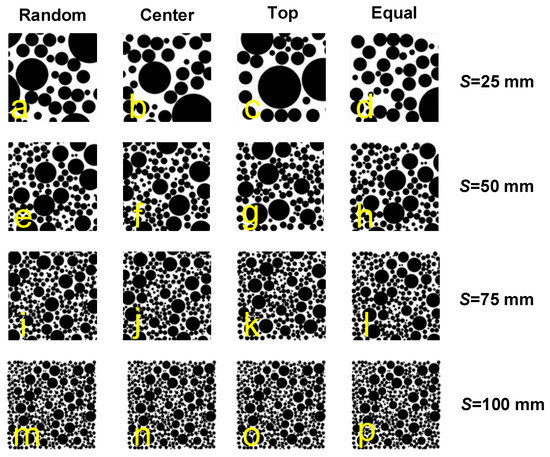 Typical model display under different simulation testing conditions in SRM–1. (a–d) S = 25 mm, (e–h) S = 50 mm, (i–l) S = 75 mm, (m–p) S = 100 mm; segmentation types are random, center, top, and equal.