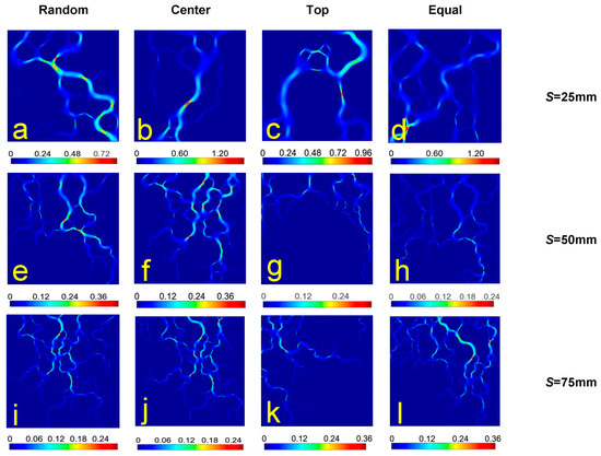 Seepage field velocity cloud map of different segmentation types in SRM–1 (unit: cm/s). (a–d) S = 25 mm, (e–h) S = 50 mm, (i–l) S = 75 mm; segmentation types are random, center, top, and equal.