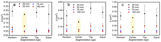 Relationship between segmentation types and average permeability. (a) SRM–1; (b) SRM–2; (c) SRM–3.