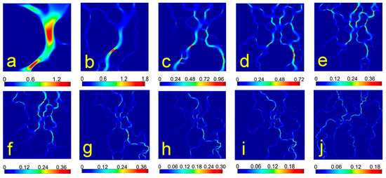 Seepage field velocity cloud map for different model feature sizes in SRM–1 (unit: cm/s). (a–j) S = 10, 20, 30, 40, 50, 60, 70, 80, 90, 100 mm.