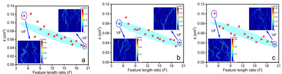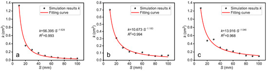 Relationship between feature length ratio and permeability. (a) S = 50 mm; (b) S = 80 mm; (c) S = 100 mm.