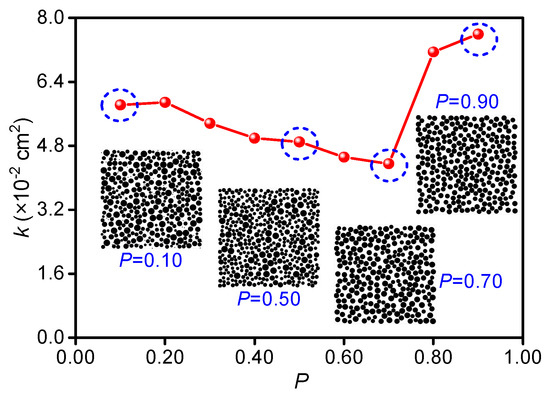 Figure 15 illustrates how significantly the feature ratio of soil/rock particle size affects the seepage characteristics of the SRM. Overall, the permeability of the SRM shows a characteristic of first slowly decreasing and then sharply increased with the increase in P. When compared to the model samples at the critical soil/rock particle size feature ratio (P = 0.10, P = 0.20, P = 0.70, and P = 0.90), it can be seen that as P increases, the difference in soil/rock particle size in the model sample decreases, changing the sample’s pore structure from a multilevel distribution to almost a single–graded sample. At P > 0.70, the soil/rock particle size is nearly the same, almost becoming “rock”, forming a skeleton structure together, so its permeability increases suddenly.