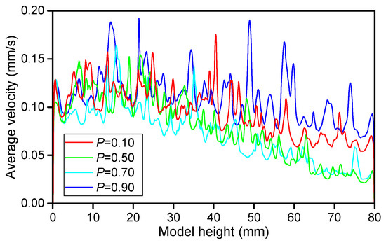 It can also be seen that the average seepage velocity of the model sample is typically higher when P = 0.90, while the average seepage velocity of the model sample is the lowest when P = 0.70, which corresponds to the permeability value shown in Figure 15. This is in comparison to the average velocity distribution curve of the seepage field in Figure 16. The average seepage velocity curve’s shape also changes from multiple wave peaks and complex bending to a single wave peak and smooth characteristics with an increase in P value, which is closely related to the particle size distribution of soil and rock and also corresponds to the evolution characteristics. These findings come from examining the shapes of each average seepage velocity curve under various particle size feature ratios of soil and rock.