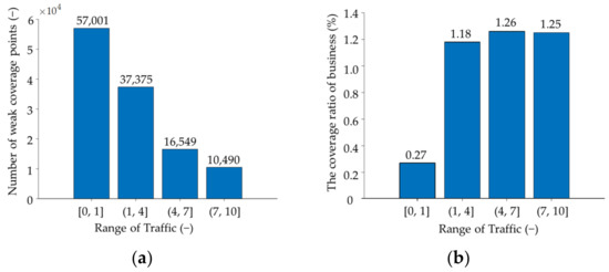 Data comparison of weak coverage points in different traffic sections. (a) corresponds to number of the weak coverage points, (b) corresponds to the coverage ratio of the business.