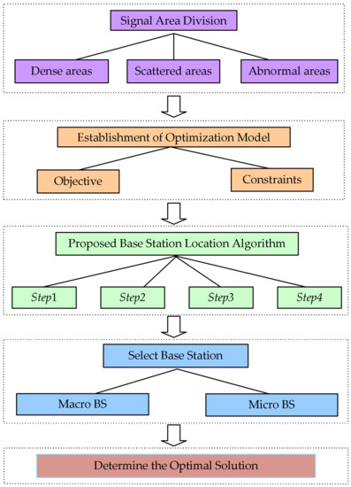 The solution of the base station planning scheme is completed in four steps. This method can be well adapted to different actual service volumes. The flowchart of the algorithm is shown in Figure 5:
