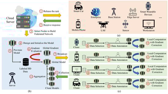 Instead of randomly selecting a group of network nodes to build a federated network, we adopt a task-driven server and client selection strategy. Generally speaking, by releasing the task in the global network, we could receive the response from the target group where various network nodes would be contained, such as mobile phones, smart cars, enterprises, etc., as illustrated in Figure 1a. As the base of our semi-FAL, we would like to select a node having sufficiently idle computing resources and task-related labeled data to be the server of the federated network. Nodes with good infrastructures, such as enterprises, base stations and edge servers, usually have more computing resources than those primarily used to provide applications. In addition, data are produced constantly. For historical data, it is made to be a public dataset, deleted or stored in some nodes. For example, historical data that are related to the business would be accessible and found in an enterprise node. Thus, an optimal node with plenty of computing resources and historical data could be found among the target group as the server.