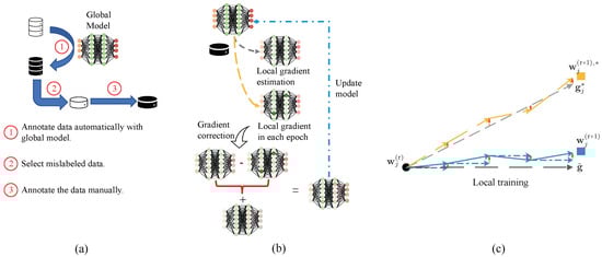 Data Annotation (Minimize the Annotation Cost): In each client, to reduce the manual annotation cost as much as possible, we need to find the critical instances for local training in each round. As illustrated in Figure 2a, the global model accepted by the client would be used to annotate local unlabeled data automatically at first. This process is equal to the model test; that is, input the unlabeled instance into the model and then output the label of the instance. After outputting the label of all local data, the owner of these data would determine whether these labels are correct. In this process, the data of the same label would be presented to the owner in the form of a batch so that the mislabeled data can be easily detected. These mislabeled instances are the critical instances in this round of training. Therefore, these instances would be selected and annotated manually as shown in Lines 5–6 of Algorithm 1. Furthermore, this process could be replaced by some intelligent methods, such as setting the probability thresholds of model output for a different label. Note that this would lead to the worse non-IID issue where only the key instances of each client are used to execute the local training. Thus, we design a gradient correction mechanism to reduce the negative impact of non-IID data.